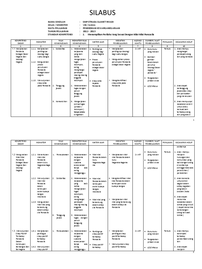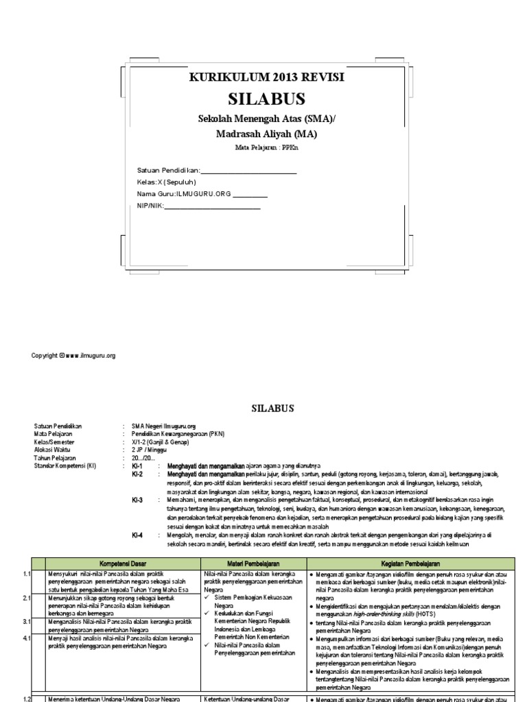 Silabus pkn kelas 10 semester 1 dan 2 kurikulum 2013 edisi revisi 2021 ini merupakan perangkat pembelajaran yang sangat penting bagi seorang guru sebab melalui perangkat pembelajaran silabus maka kita dapat mengetahui materi apa saja yang akan kita jabarkan ke dalam rencana perangkat. Dapat dipercaya ( trustworthines) ketulusan ( honesty ) integritas ( integrity. Savesave silabus pkn kelas x sma for later. Menerapkan hidup rukun dalam perbedaan. Silabus pkn kelas xfull description.