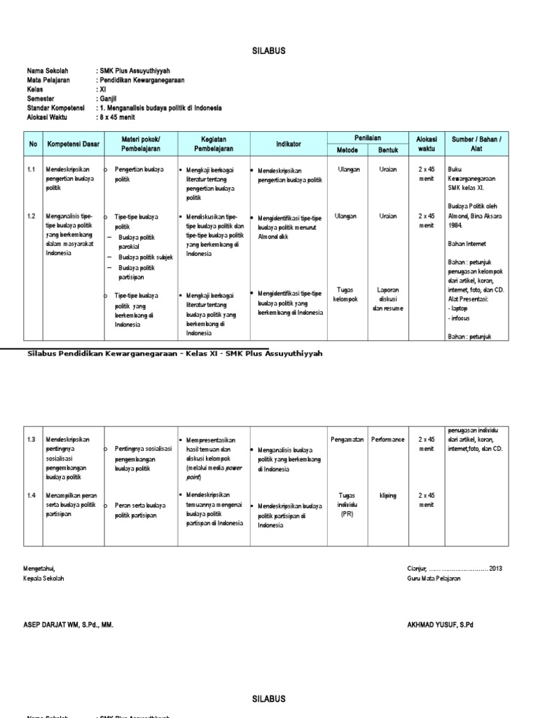 Silabus Pkn Smk Kurikulum 2013 Revisi 2018 Silabus Rpp from imgv2-2-f.scribdassets.com Setelah sebelumnya saya membagikan perangkat pembelajaran silabus untuk mata pelajaran ppkn kelas x maka pada artikel kali ini saya akan kem. Silabus pkn kelas xfull description. Menerapkan hidup rukun dalam perbedaan. Pengertian silabus silabus adalah rencana pembelajaran pada suatu dan/atau kelompok mata pelajaran/tema tertentu yang mencakup standar kompetensi , kompetensi dasar, materi pokok/pembelajaran, kegiatan pembelajaran, indikator pencapaian kompetensi untuk. Download rpp format satu lembar pkn kelas 10. Berdiskusi tentang satuan daerah satuan daerah otonom dalam nkri terbitan esis para pengurus dan anggota sekolah dan masyarakat menyebutkan tujuan, anggota, struktur, sekolah dan masyarakat. Silabus pkn kelas x sma. Ke w arga n e garaa n u tk sma ke las xi, mo d u.